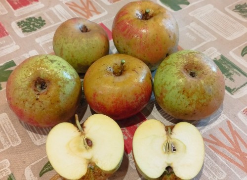 La date de floraison coïncide avec mon reine des reinettes, soit mi-avril. Le scion est jeune mais vigoureux et rustique (pas vu de tavelure, pas attaqué par le carpo alors que d'autres de mes pommiers en sont farcis). Les pommes sont grosses (entre 7 et 9 cm de diamètre et 200 à 300g). J'ai du les cueillir car le vent a commencé à les faire tomber mais je pense qu'elles ne sont pas tout à fait mûres. A la dégustation la pomme est juteuse, sucrée et acidulée, la peau relativement fine et un peu rugueuse. La chair est crème assez ferme et dense.